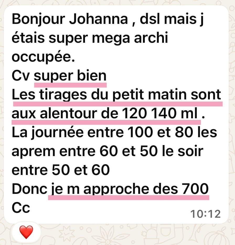 A l'époque le programme WORKING MOM n'existait pas encore donc elle a eu besoin d'un suivi personnalisé pour relancer sa lactation malgré la reprise du travail à des horaires assez intensives.